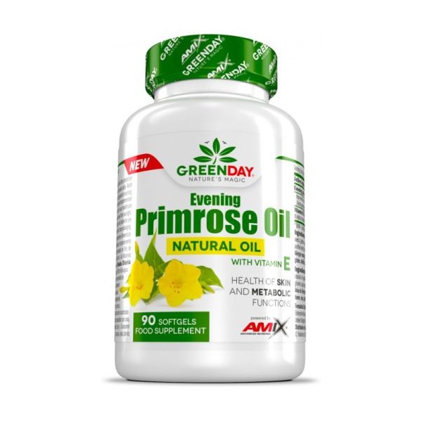 Evening Primrose Oil de Amix dentro de su línea más saludable GreenDay es un suplemento en perlas que te proporciona 3.000 mg de aceite de onagra en combinación con vitamina E por dosis de 3 perlas.