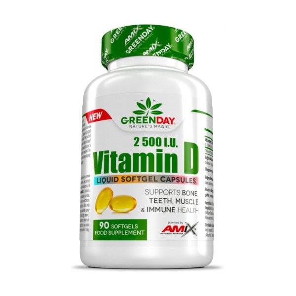 Vitamin D 2500 IU de Amix dentro de su línea más saludable GreenDay es un suplemento en perlas que te proporciona 63 mcg de vitamina D3 (como colecalciferol) con gran poder de absorción, una vitamina esencial liposoluble que a menudo se la conoce como “la vitamina del sol“.