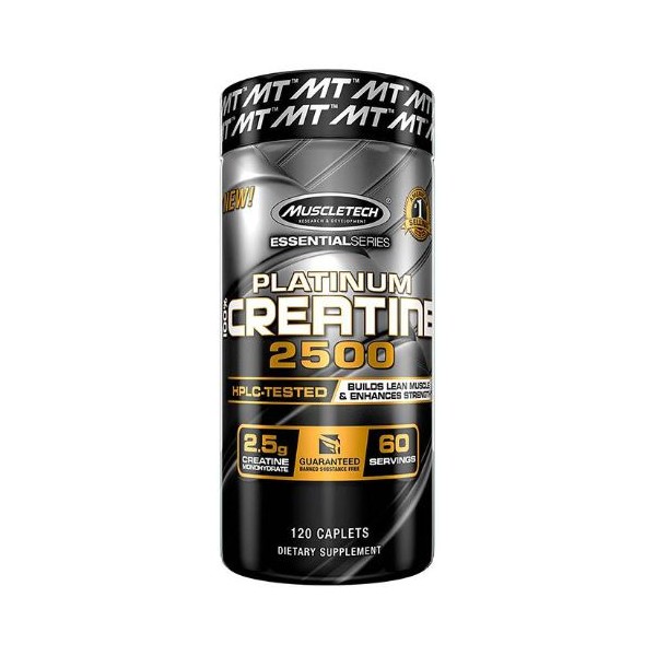 Platinum 100% Creatine 2500 dentro de la línea Essential Series de la marca Nº1 en todo el mundo Muscletech® es un suplemento en tabletas que proporciona 2.500 mg de monohidrato de creatina ultra-pura micronizada de máxima calidad por dosis de 2 tabletas.