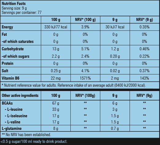 L-Leucina, L-Valina, L-Isoleucina, L-Glutamina, aroma, acidulante: ácido cítrico, antiaglomerante: dióxido de silicio, edulcorantes (sucralosa, glicósidos de esteviol), sal, clorhidrato de piridoxina (vitamina B6), colorante: tartracina.