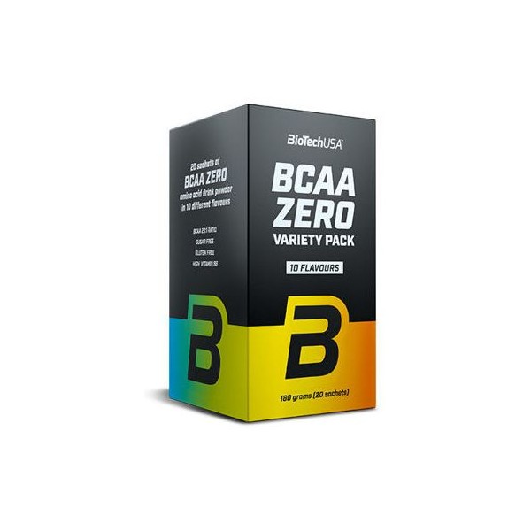 BCAA Zero Variety Pack de BioTech USA es un pack compuesto por 20 sobres de BCAA Zero, un suplemento que contiene una fórmula con 6 gramos de aminoácidos de cadena ramificada con un ratio 2:1:1 entre leucina, valina e isoleucina, 700 mg de L-Glutamina y vitamina B6.