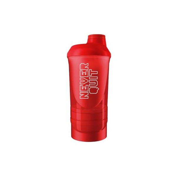 Shaker Never Quit te proporciona la libertad y ventaja que supone llevar todo lo que necesitas para todo el día, en una sola unidad. Es mucho más conveniente que llevar tres agitadores individuales, o peor aún, transportar a todos lados tus envases de suplementos.