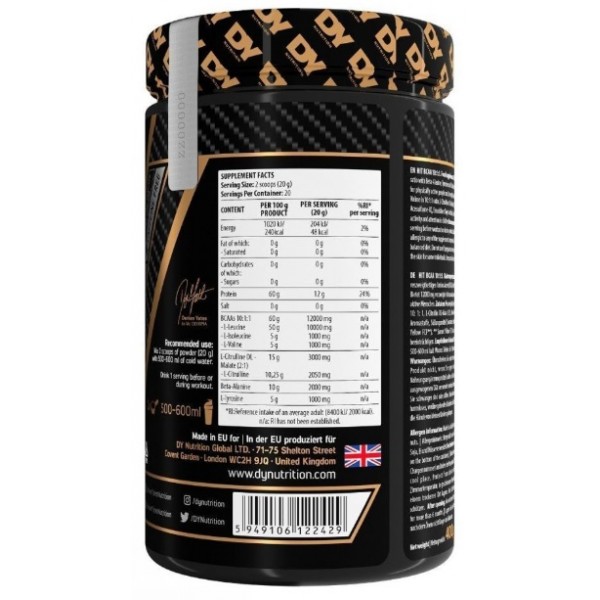 12 gramos de BCAAs con ratio 10:1:1, además de 3 g citrulina, 2 g beta alanina y 1 g tirosina.