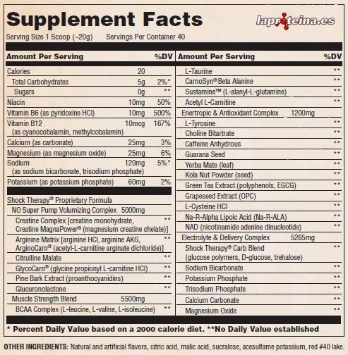 La fórmula patentada Shock Therapy® incluye una mezcla para la producción de óxido nítrico y la voluminizacion celular que incluye un complejo de creatina (Monohidrato de creatina, creatina MagnaPower®), una matriz de diferentes formas de arginina (Arginina HCL, Arginina AKG, ArginoCarn® [Acetil-L-Carnitina arginato dicloruro), malato de citrulina, GlycoCarn® (Glycine Propionil L-Carnitina HCL), extracto de corteza de Pino Extracto (Pycogenol) y glucuronolactona.