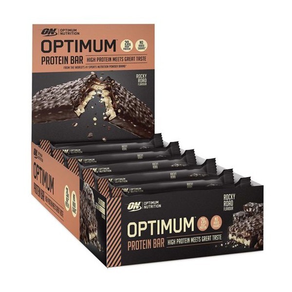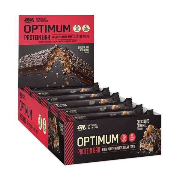 Optimum™ Protein Bar de Optimum Nutrition son unas deliciosas barritas altas en proteína con un sabor irresitible envueltas en un recubrimiento de verdadero chocolate negro belga, con una capa interior de sabroso caramelo y una base interior suave y cremosa rematada con trozos de cacahuete, trozos de almendra y/o crujientes de soja y cacao según la versión.