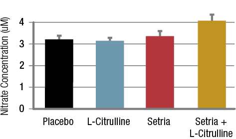 La combinación de L-citrulina y el aporte complementario de Setria® aumentó significativamente los niveles de óxido nítrico.
