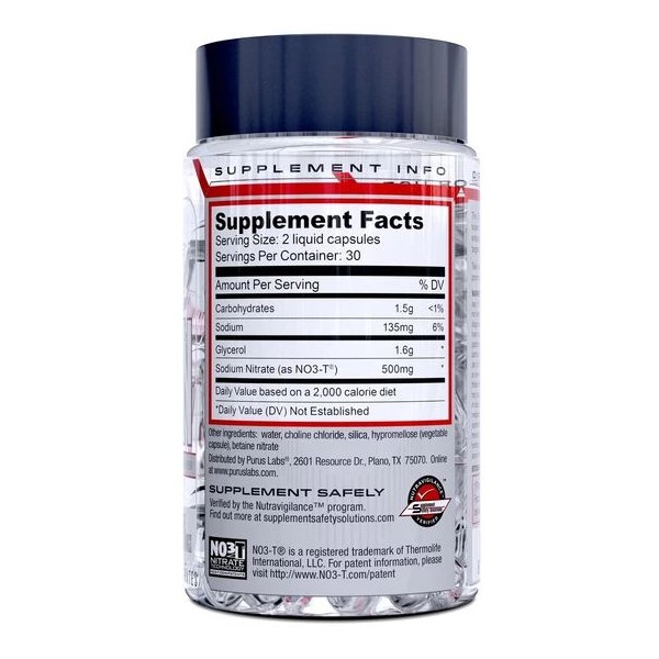 NOXygen™ de Purus Labs es un suplemento en cápsulas líquidas libre de estimulantes diseñado para proporcionarte un increíble bombeo muscular gracias a la combinación sinérgica de 3 compuestos muy avanzados de óxido nítrico: glicerol, nitrato de soldio NO3-T® y nitrato de betaína.