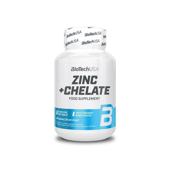 Zinc + Chelate de BioTech USA es un suplemento en tabletas que proporciona 12 mg de zinc como óxido de zinc y bisglicinato de zinc, una forma orgánica que es absorbida fácilmente por el cuerpo.
