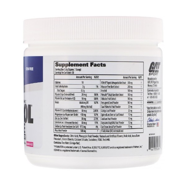 Maca Root Powder, KSM-66® Organic Ashwagandha Root Extract, Masson Pine Bark Extract, Inositol, PrimaVie® Shilajit Gum Resin Extract, Tribulus Fruit Extract, Fenugreek Seed Powder, Saw Palmetto Fruit Powder, Ginkgo Leaf Powder, Epimedium Stem or Leaf Extrac, Cnidium Fruit Powder, Eurycoma longifolia Root Powder, Oat Straw Aerial Part Powder, Vitamin D (as Cholecalciferol), Vitamin B6 (as Pyridoxine HCl), Folate (400 mcg Folic Acid), Vitamin B12 (as Methylcobalamin), Magnesium (as Magnesium Oxide), Zinc (as Zinc Sulfate), Selenium (as L-Selenomethionine), Sodium (as Pink Himalayan Sea Salt),
