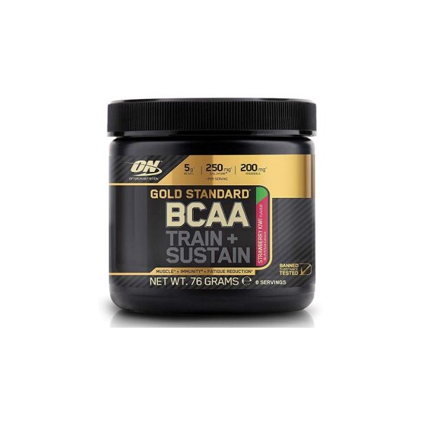 Gold Standard BCAA™ Train + Sustain de Optimum Nutrition es un suplemento en polvo que contiene una mezcla de aminoácidos de cadena ramificada en una proporción 2:1:1 reforzada con el nuevo compuesto de betaglucanos Wellmune®, extracto de raíz de Rhodiola Rosea, electrolitos y vitamina C.