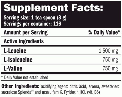 Se trata de un suplemento anti-catabólico que provee al organismo de una dosis óptima de aminoácidos de cadena ramificada necesarios para el mantenimiento del tejido muscular durante el estrés físico y el ejercicio intenso.