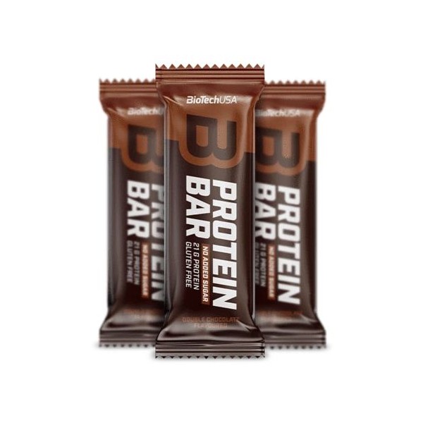 Las nuevas barritas Protein Bar de BioTech USA son unas deliciosas barritas de 70 gramos que te proporcionan 21 gramos de proteína por unidad, sin azúcar añadido, sin gluten y ricas en fibra que tienes disponibles en 8 sabores a doble chocolate, pistacho, plátano, mantequilla de cacahuete, fresa, cookies & cream, vainilla-coco y caramelo salado.