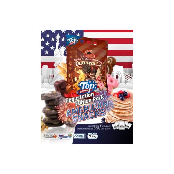 Oatmeal Top Flavors Degustación American Snacks de la línea Max Protein de Universal McGregror son las conocidas harinas de avena micronizada con los mejores sabores en un pack que incluye 5 bolsas individuales de 300 gramos con los sabores White BigChoc, BigCrac, Pink Cake, Biggers y BoomBig.