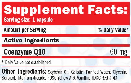 Aceite de soja, gelatina de carne, agua purificada, glicerina, coenzima Q10, sorbitol, dióxido de titanio, colorante amarillo FD & C, vainillina, colorante FD & C rojo.