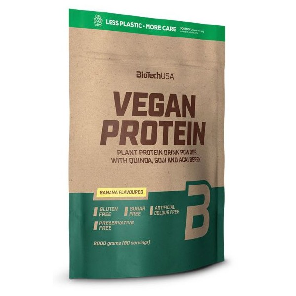 Vegan Protein de BioTech USA es un suplemento en polvo que contiene una mezcla de aislado de proteína de guisante y proteína de arroz que está enriquecida con harina de quinoa, bayas de goji en polvo, acai en polvo y aminoácidos funcionales (L-glutamina y L-arginina).