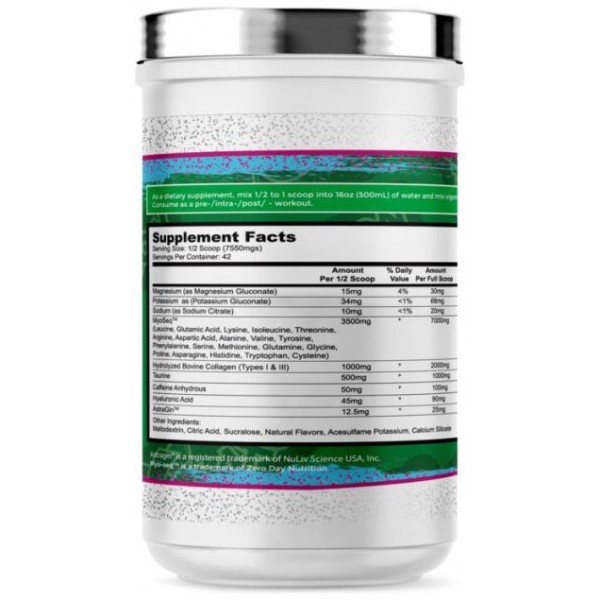 MyoSeq (Leucine, Glutamic Acid, Lysine,Isoleucine, Threonine, Arginine, Aspartic Acid, Alanine, Valine, Tyrosine, Phenylalanine, Serine, Methionine, Glutamine, Glycine, Proline, Asparagine, Histidine, Tryptophan, Cysteine), Hydrolyzed Bovine Collagen (Types I & II), Taurine, Caffeine Anhydrous, Hyaluronic Acid, AstraGin, Magnesium (as Magnesium gluconate), Potassium (as Potassium Gluconate), Sodium (as Sodium Citrate).