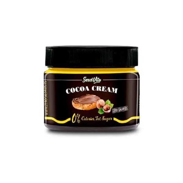 Crema de Cacao de Servivita es una deliciosa crema de chocolate con edulcorantes, sin azucar añadido y con menos de 4 kcal por ración, ideal para untar en el pan, con tus postres o directamente para comer con la cuchara y disfrutar de todo el sabor del chocolate sin tener que sentirte culpable por ello.