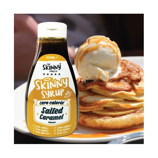 El nuevo sirope Skinny Syrup Salted Caremel de Skinny Food tiene todo el sabor de un sirope de caramelo salado convencional, pero sin prácticamente calorías, ideal para acompañar toda clase de postres, batidos tortitas y cualquier receta dulce que se te ocurra, que podrás tomar a todas horas sin sertirte culpable por ello.