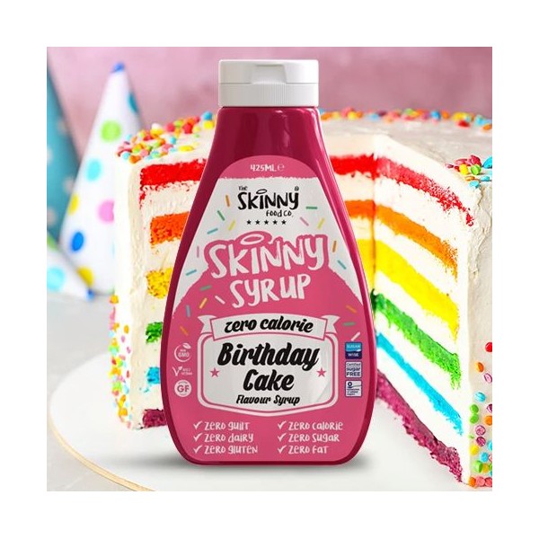 - Delicioso sirope con el sabor del pastel de cumpleaños sin azúcares ni grasas.