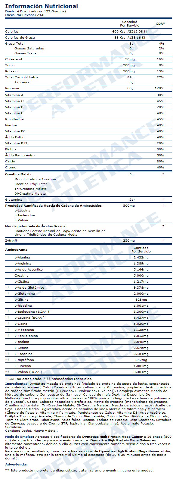 Cada servicio entrega 600 calorías masivas, con 60 gramos de proteínas de la más alta calidad, además de 5 gramos de Creatina adicional, 2 gramos de Glutamina, BCAA (amino-ácidos) y una razonable mezcla de vitaminas y minerales junto a una mezcla patentada de ácidos grasos !Todo en cada servicio!