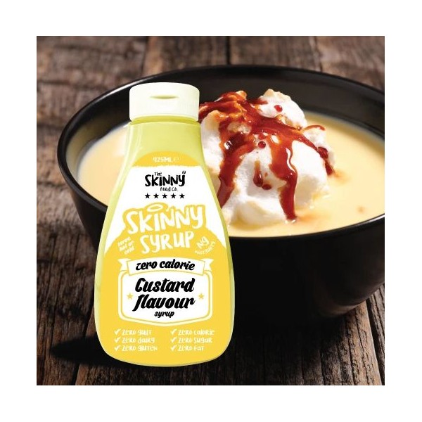El nuevo sirope Skinny Syrup Custard de Skinny Food tiene todo el sabor de las natillas convencionales, pero sin prácticamente calorías, ideal para acompañar toda clase de postres, batidos tortitas y cualquier receta dulce que se te ocurra y que podrás tomar a todas horas sin sertirte culpable por ello.