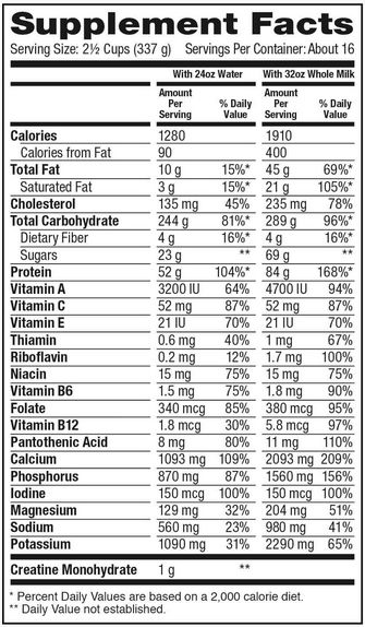 - Con 1217 kcal, 231 g de carbohidratos, 52 g de proteína y 11 g de BCCAs por dosis.