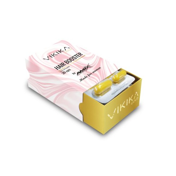 Hair Booster de la nueva línea Vikika Gold de Amix Nutrition es un suplemento en cápsulas destinado especialmente para mujeres activas y conscientes de la importancia de seguir unos hábitos saludables que contiene una mezcla exclusiva del grupo B (B1, B2, B3, B5, B6, B9 - ácido fólico, B12), Vitamina C, Vitamina E, Zinc y biotina.