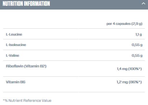 L-Leucina (38%), L-isoleucina (19%), L-Valina (19%), gelatina, agente de carga (celulosa), agente antiaglomerante (sales de magnesio de ácidos grasos), antioxidante (ácido ascórbico), vitamina B6, riboflavina.