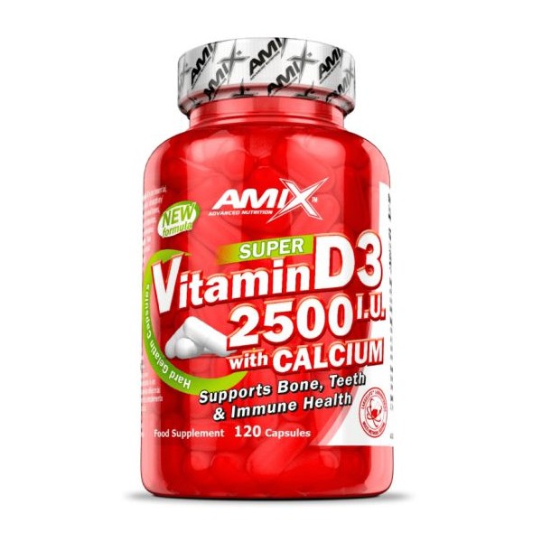 Vitamin D3 2500 IU with Calcium de Amix es un suplemento en cápsulas que te proporciona 62,5 mcg de vitamina D3 (como colecalciferol) con gran poder de absorción, enriquecida con 250 mg de calcio.