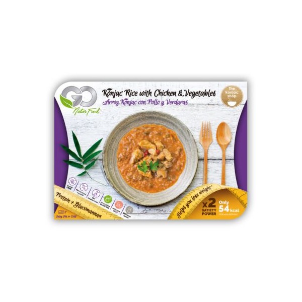 Delicioso Arroz Konjac con pollo y vegetales de Go Natur Food te aporta unos valores nutricionales muy equilibrados, es bajo en calorías y carbohidratos, pero muy alto en proteínas, ideal para dietas bajas en carbohidratos y altas en proteínas, dietas sin gluten y para diabéticos.
