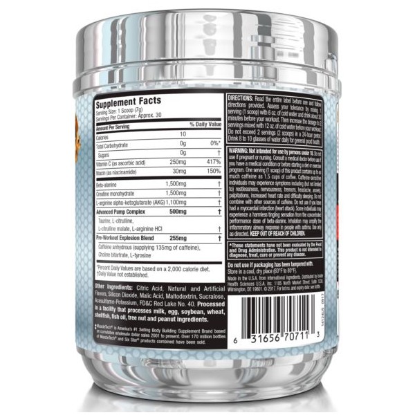 Pre-Workout Explosion de Six Star® Pro Nutrition es un suplemento en polvo que contiene una fórmula de pre-entrenamiento diseñada para proporcionarte una energía extrema y una gran concentración mental, que te ayudará a mejorar y aumentar tu fuerza y tu masa muscular, que mejora el bombeo muscular y tu resistencia durante el entrenamiento para que puedas entrenar con mayor intensidad.