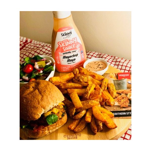 La nueva salsa Skinny Sauce Mayochup Mayo de Skinny Food tiene todo el sabor de la mayonesa mayochup, una deliciosa combinación del sabor del ketchup, de la mayonesa y una mezcla especial de especias, sin prácticamente calorías, ideal para potenciar el sabor de tus carnes, hamburguesas, ensaladas o de cualquier receta a la que quieras darle un toque original, y que podrás tomar a todas horas sin sertirte culpable por ello.