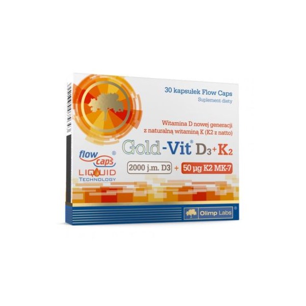 Gold-Vit D3+K2 de Olimp® Sport Nutrition es un suplemento en cápsulas que contiene una combinación de vitamina D (D3) y Vitamina K (K2) en una forma altamente biodisponible.