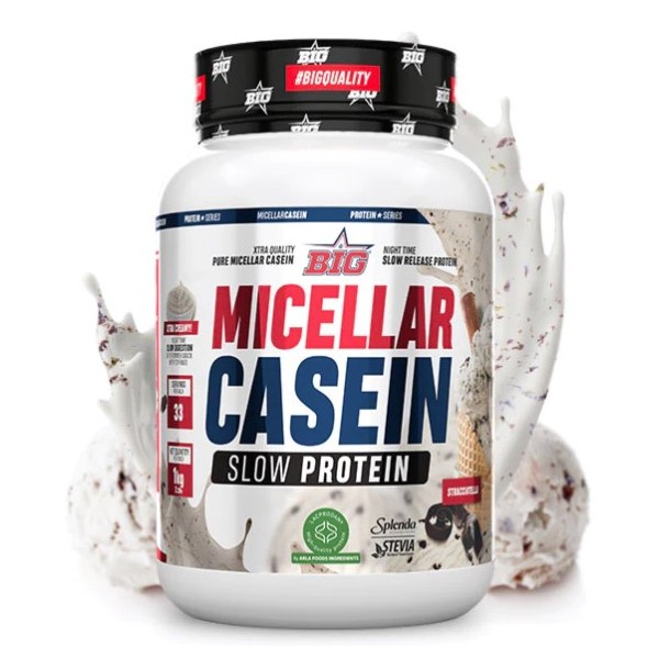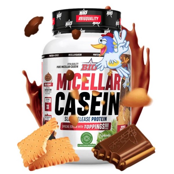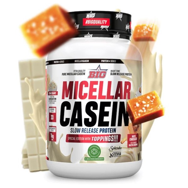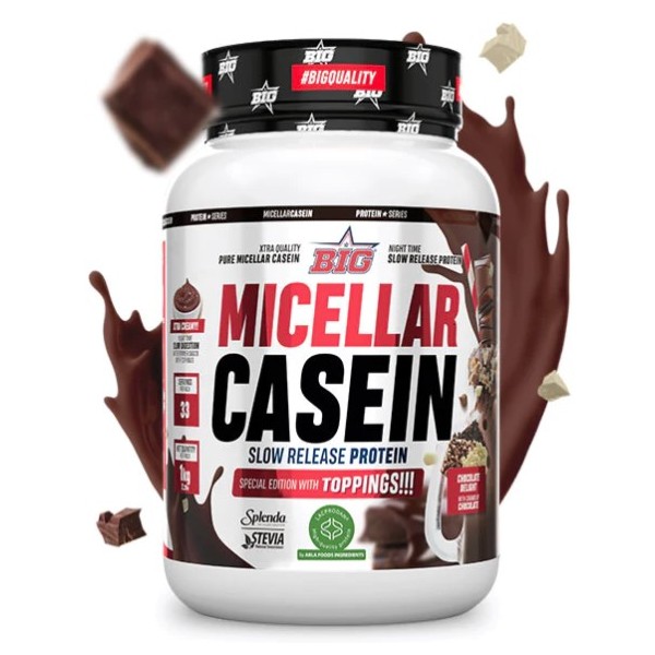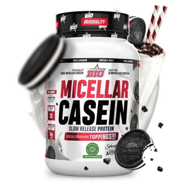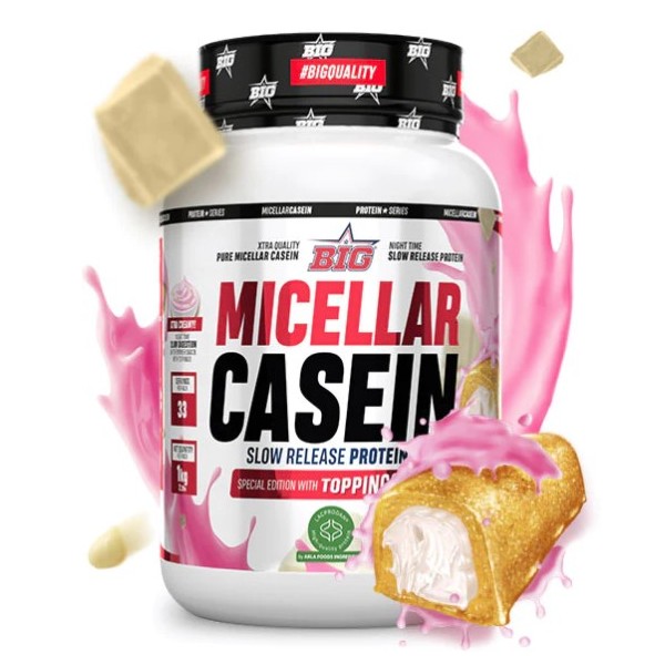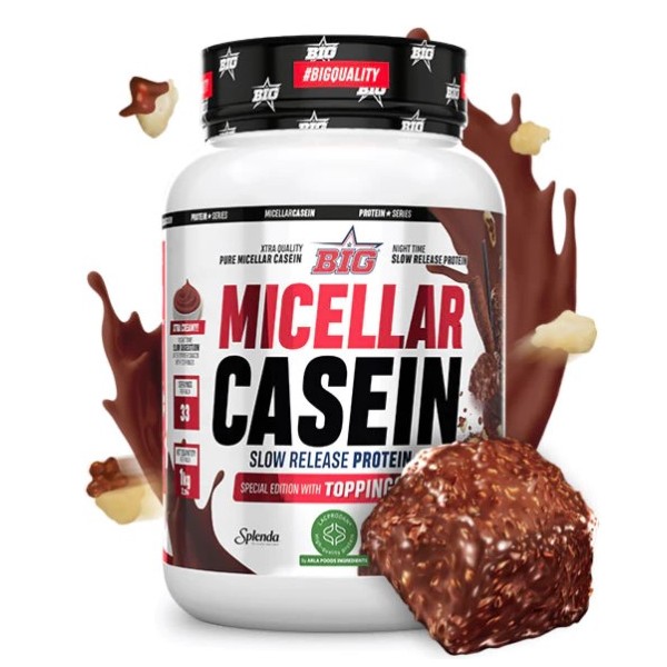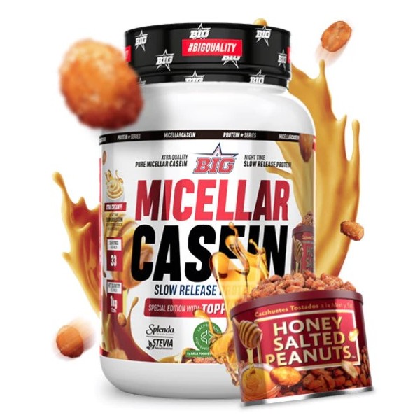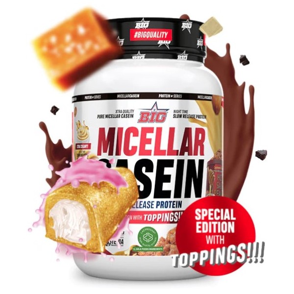Micellar Casein with Topping de Big es un suplemento proteico en polvo que contiene una mezcla proteica de lenta digestión y gran calidad especialmente diseñada para utilizar por la noche antes de dormir, compuesta por una combinación de caseína micelar Lacprodan MicelPure® y concentrado de suero de leche Lacprodan® SP-8011V Instant.