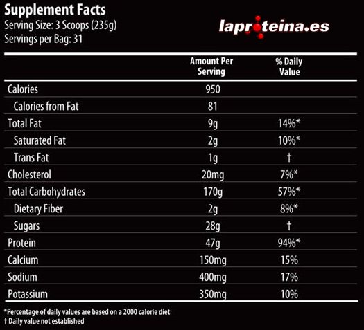 Waxybolic™ matriz de hidratos de carbono (hidrolizado y fraccionado almidón de maíz ceroso, polímeros de glucosa, levulosa, jarabe de arroz hidrolizado, trehalosa), MASSFUSION ™ Penta-fase de aminoácidos de liberación sostenida de matriz de proteínas mejoradas (espectro completo de proteina hidrolizada, hidrolizado de caseína, aislado de proteína de suero microfiltrada por flujo cruzado, caseína micelar, concentrado de proteína de suero de leche, l-glutamina, L-leucina, isoleucina-l, l-valina, l-glicina), CEO ™ Complejo avanzado de creatina (monohidrato de creatina, creatina éster etílico, orotato de creatina), SuperFats ™ complejo metabólico de ácidos grasos (ácido linoleico conjugado a partir de aceite de girasol, triglicéridos de cadena media de aceite de coco fraccionado, crema no láctea (aceite de girasol, jarabe de maíz sólido, caseinato de sodio, mono y di-glicéridos, di-fosfato de potasio, tri-fosfato de calcio, lecitina de soja, tocoferoles)), sabores naturales y artificiales, goma xantana, goma de celulosa, carragenina, color caramelo, sucralosa, acesulfamo de potasio.