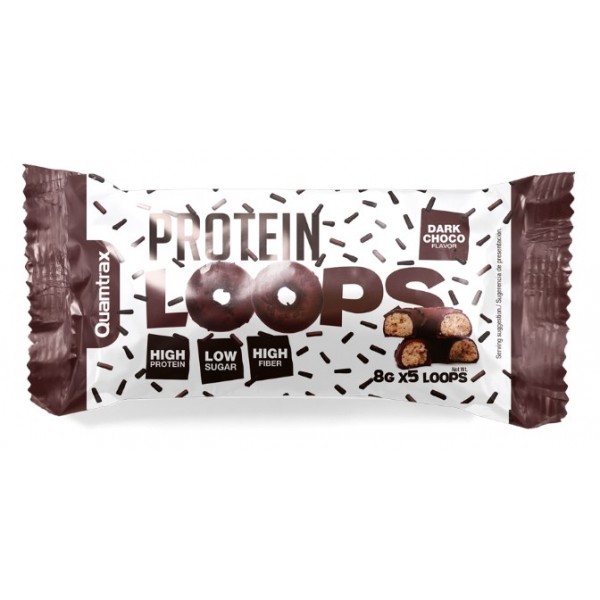 Protein Loops de Quamtrax Nutrition son unas deliciosas galletas con forma de rosquilla, altas en proteínas y fibra, con un contenido muy bajo en azúcar y recubiertas de irresistible chocolate negro, chocolate con leche o chocolate blanco.