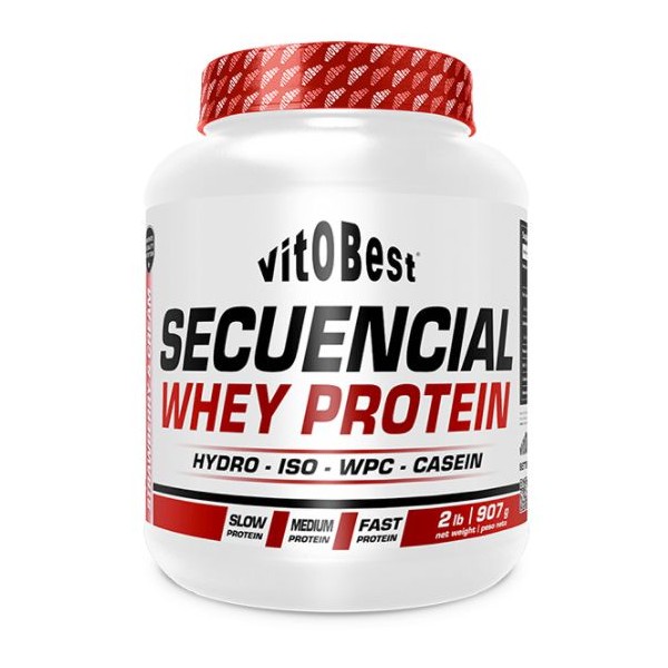 Secuencial Whey Protein de Vitobest es un suplemento proteico en polvo que combina diferentes fuentes proteicas con distinta velocidad de digestión entre las que se incluye concentrado de proteína de suero WPC Lacprodan® 80, aislado de proteínas lácteas (MPI caseína 90), L-glutamina (Ajinomoto®), aislado de proteína de suero WPI Lacprodan® 90 y aislado de proteína de suero hidrolizado (HydroClear®).