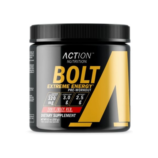 Bolt Extreme Energy de Action Nutrition es un suplemento de pre-entrenamiento en polvo que contiene una fórmula concentrada que combina a la perfección una intensa energía con la mejora del rendimiento durante el entrenamiento.