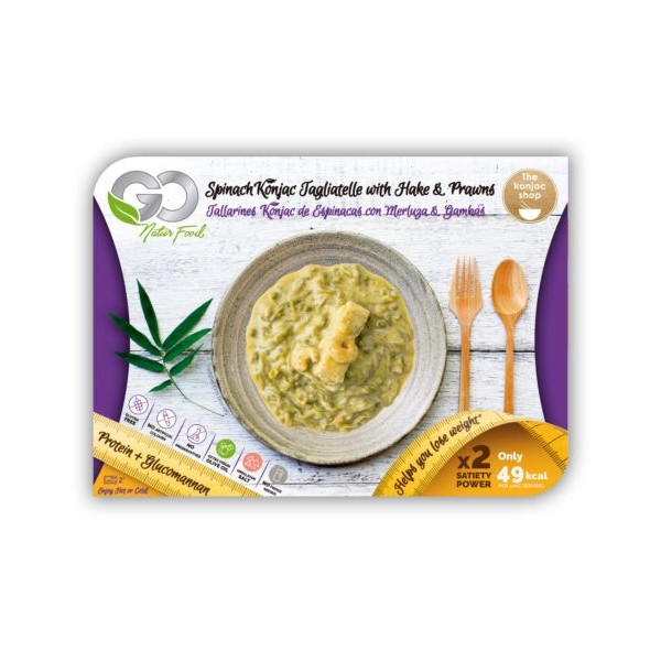 Los tallarines konjac de espinacas con merluza y gambas están elaborados con konjacshirataki, una pasta hipocalórica compuesta de fibra soluble de konjac, con un contenido en fibra muy superior a la pasta normal. Esta es por esta razón por la que se trata de la pasta ideal para dietas de pérdida de peso corporal. Además, conserva todo el sabor de la receta original.