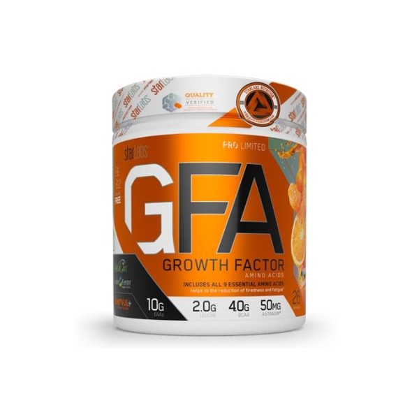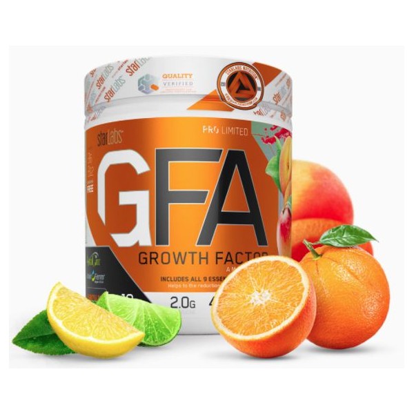 GFA Growth Factor™ de StarLabs es un suplemento en polvo que contiene una fórmula con los 9 aminoácidos esenciales en la proporción recomendada por la National Academy of American Sciences para maximizar la síntesis proteica en adultos de más de 19 años.