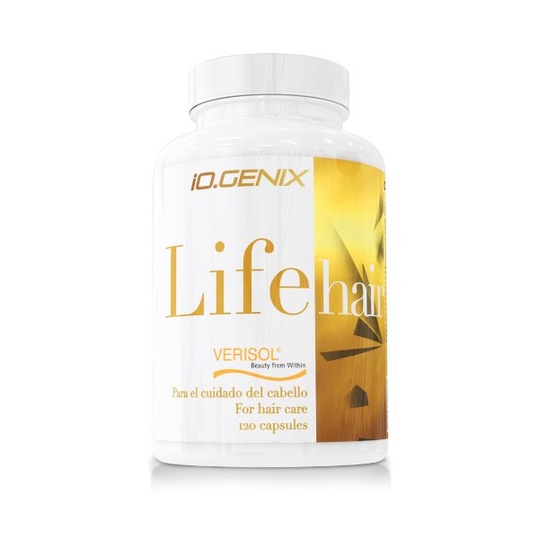 Life Hair de iO.Genix es un producto en cápsulas diseñado exclusivamente para ayudar en el cuidado del cabello, gracias a la acción conjunta del colágeno Verisol®, extracto de saw palmetto, vitaminas como la Biotina, C, B3, A, B2 y minerales como el selenio y el zinc.