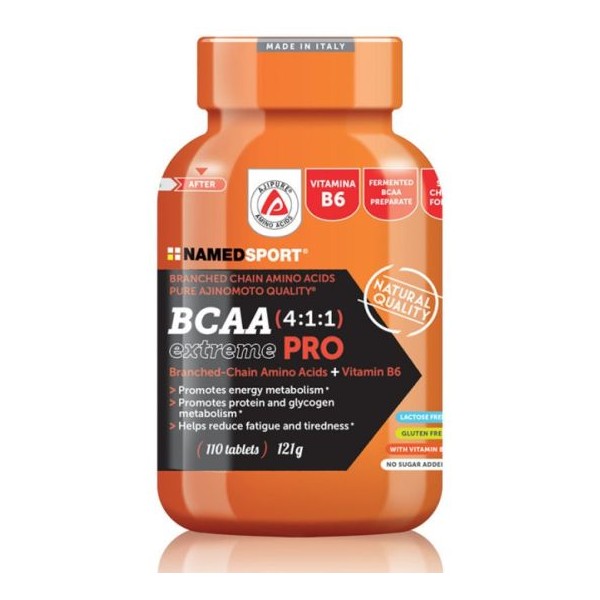 BCCA 4:1:1 Extreme PRO Ajinomoto® de Named Sport es un suplemento en tabletas que contiene aminoácidos de cadena ramificada puros producidos por Ajinomoto® con una relación 4:1:1, y potenciados con vitaminas B6.