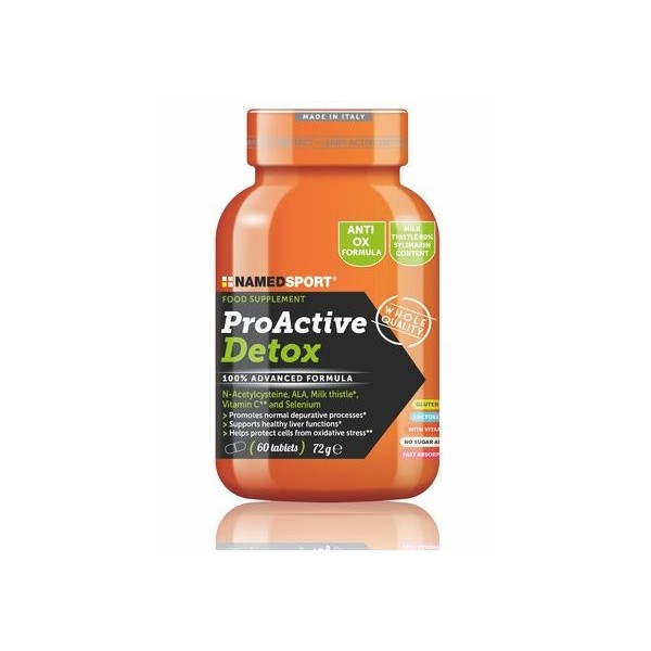 ProActive Detox de Named Sport es un suplemento en tabletas que contiene una fórmula que combina N-acetil-cisteína, ácido alfa lipoico, extracto de cardo mariano, selenio y vitaminas, diseñado para promover funciones depurativas del cuerpo, la promoción de la eliminación de residuos y toxinas y el apoyo a la función hepática.