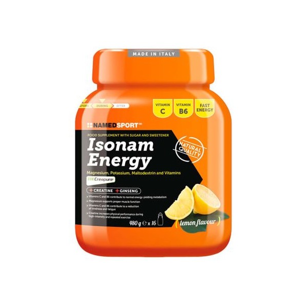 Isonam Energy de Named Sport es un suplemento en polvo que contiene una fórmula isotónica (314,24 mosm/L) a base de maltodextrina, minerales y vitaminas enriquecida con creatina Creapure® y ginseng, ideal para una reintegración de la energía, los electrolitos y una hidratación adecuada en caso de rendimiento físico prolongado o una transpiración excesiva.