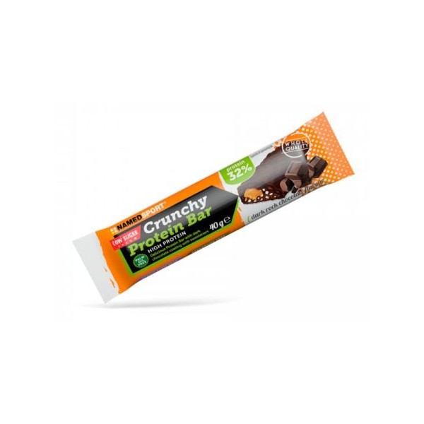 Crunchy Protein Bar de Named Sport son unas deliciosas barritas con cobertura de chocolate negro, una capa de delicioso caramelo y crispies de soja, muy bajas en azúcares, altas en fibra y que te proporcionan 13 gramos de proteína por unidad de 40 gramos.