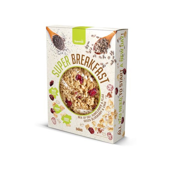 Super Breakfast de Quamtrax Nutrition son unos deliciosos copos de cereales sin azúcar añadido, mezclados con arándanos deshidratados, semillas de girasol, lino y chía que son perfectos para tomar en tus desayunos saludables.