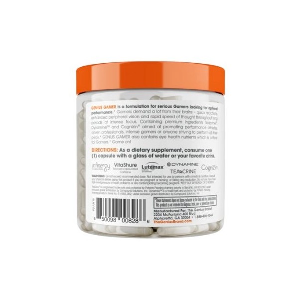 Genius Gamer de The Genius Brand es un suplemento en cápsulas que contiene una fórmula científicamente investigada diseñada para optimizar el rendimiento de jugadores de videojuegos profesionales.