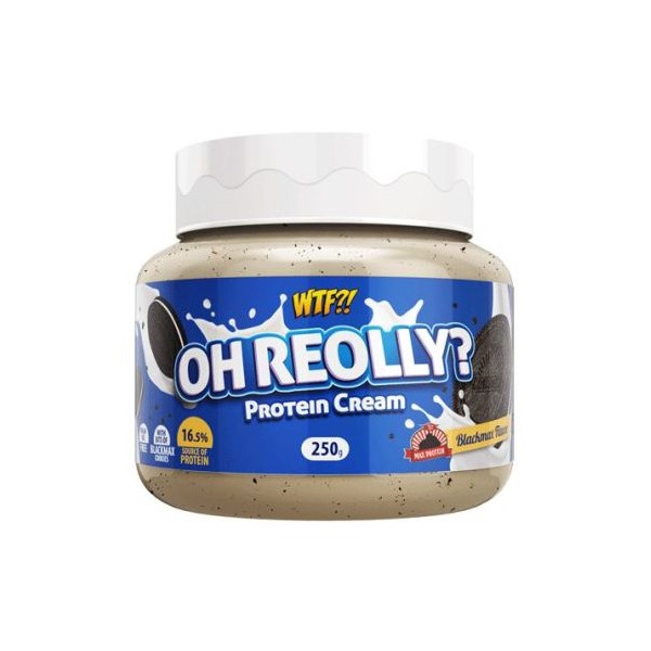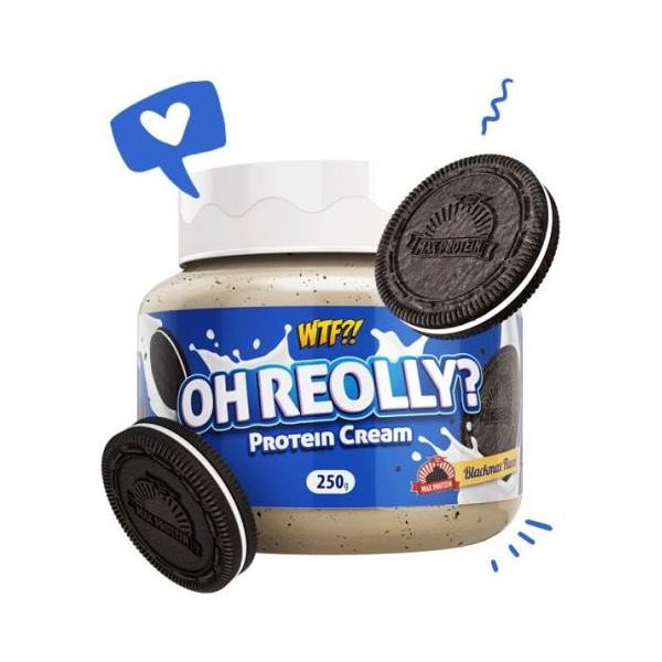 WTF?! Oh Reolly? Protein Cream de Max Protein es una deliciosa crema blanca con trozos de galleta BlackMax y relleno cremoso con un alto porcentaje de proteína, sin aceite de palma y un sabor inconfundible.