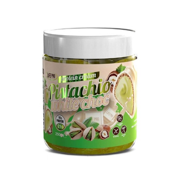 Protein Cream Pistachio White Choc de LifePro Nutrition es una deliciosa crema praliné blanca con pistacho y avellana, una mezcla deliciosa con un 20% de proteína aislada, sin azúcares añadidos ni conservantes artificiales.