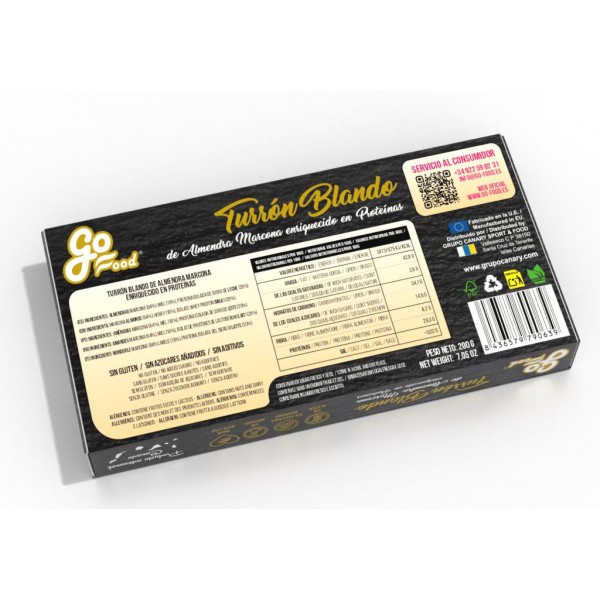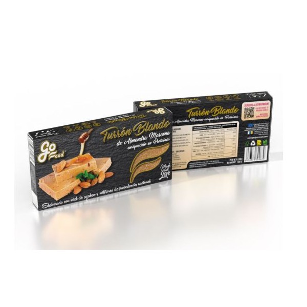 Turrón Blando de GoFood® es un delicioso turrón blando tradicional elaborado con almendras marconas y miel de azahar y milflores de procedencia nacional que está enriquecido con proteína de aislado de suero de leche.
